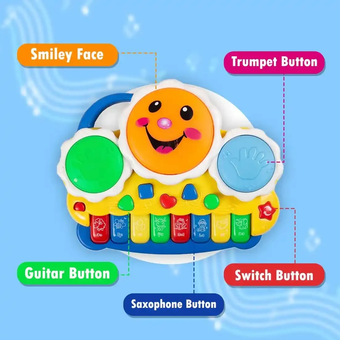 Different drum sounds and keyboard tones cultivate a sense of rhythm, pitch differentiation, and early musical awareness.