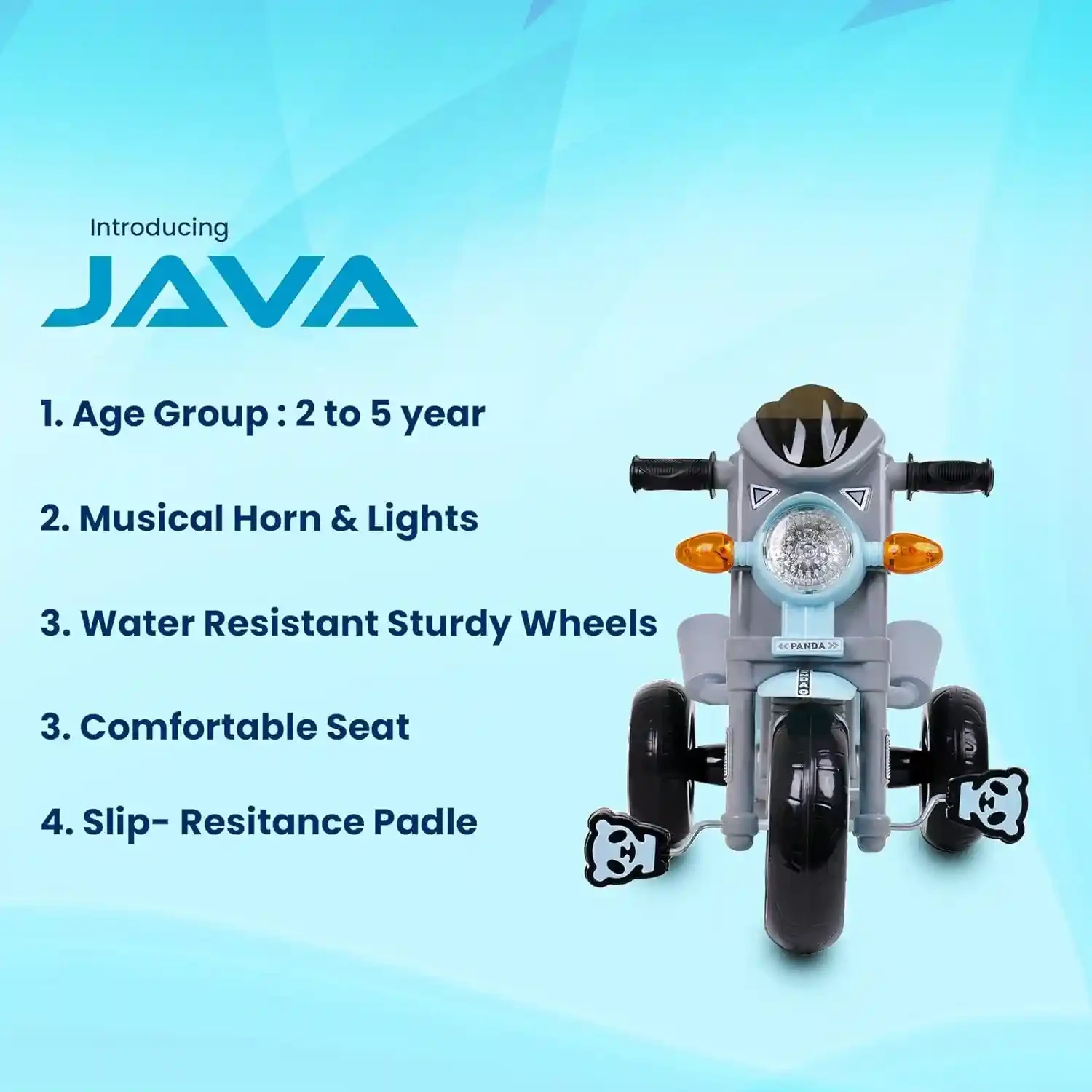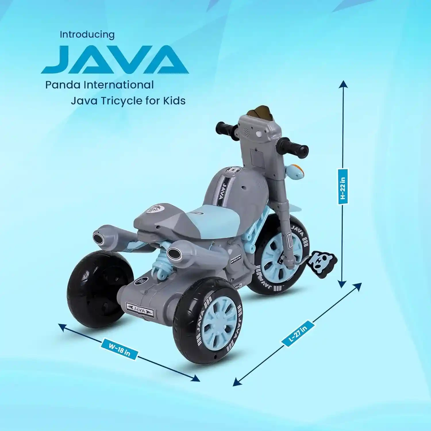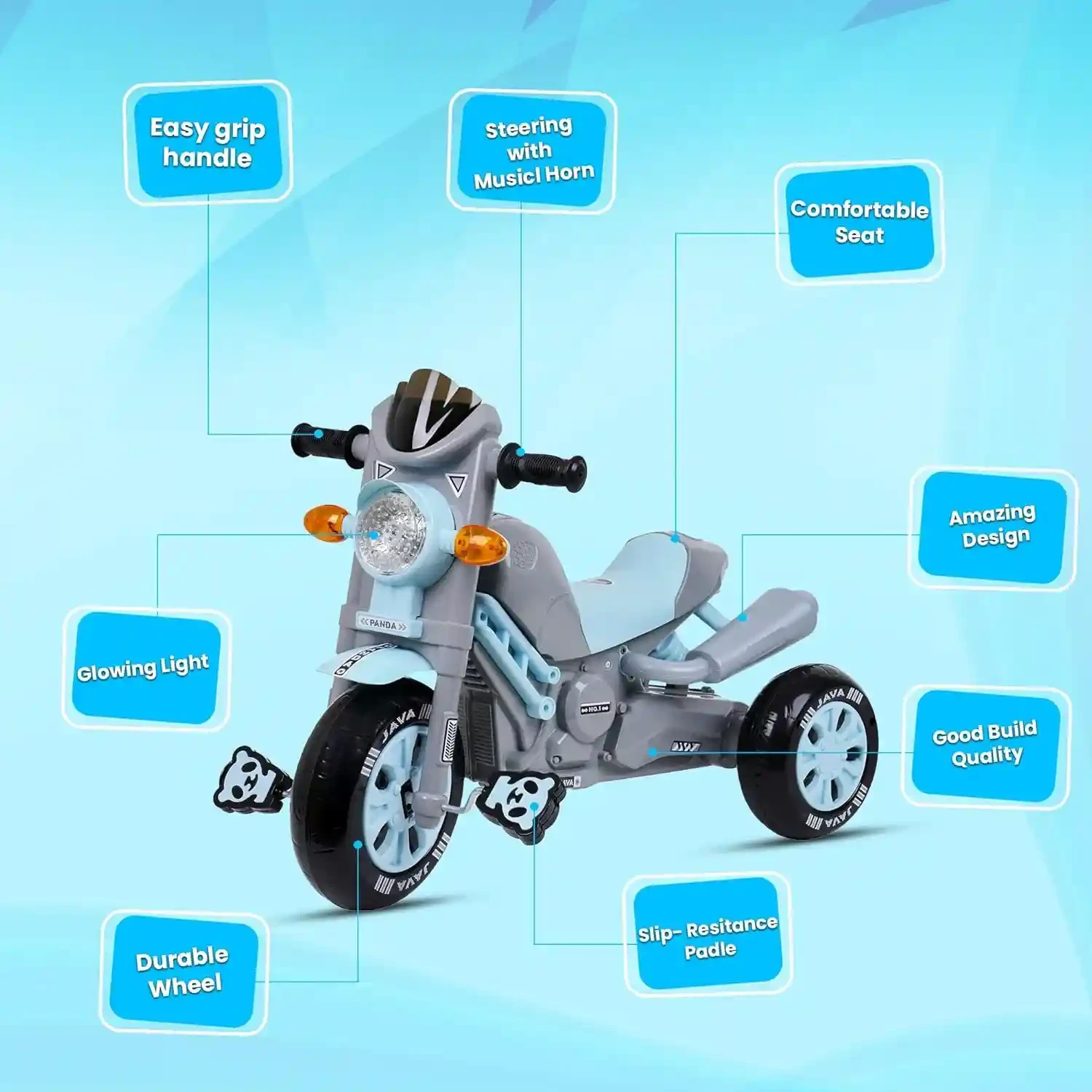 Java Bike Pedal Tricycle for Kids with Musical Horn & Lights – Adjustable Seat, Grey
