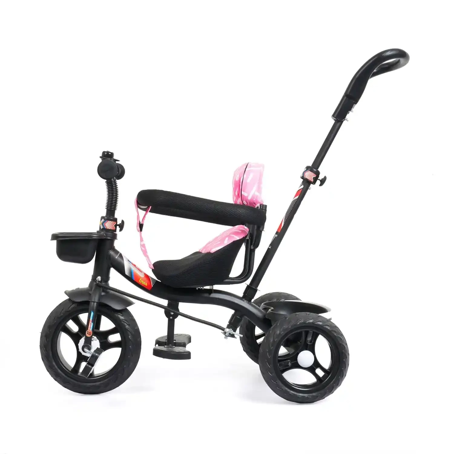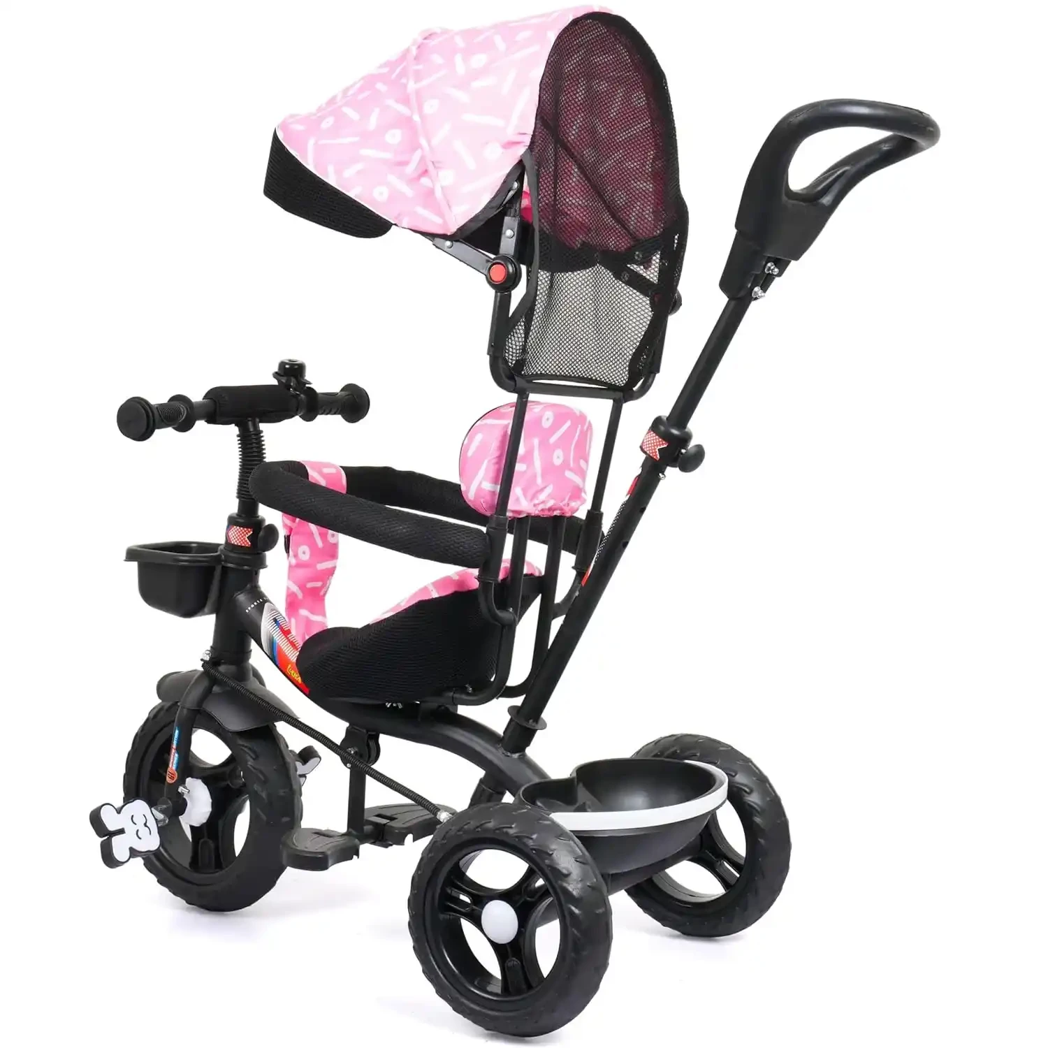 Manual Bell & Storage Basket: Fun bell for interactive play and a storage basket to carry favorite toys or essentials.