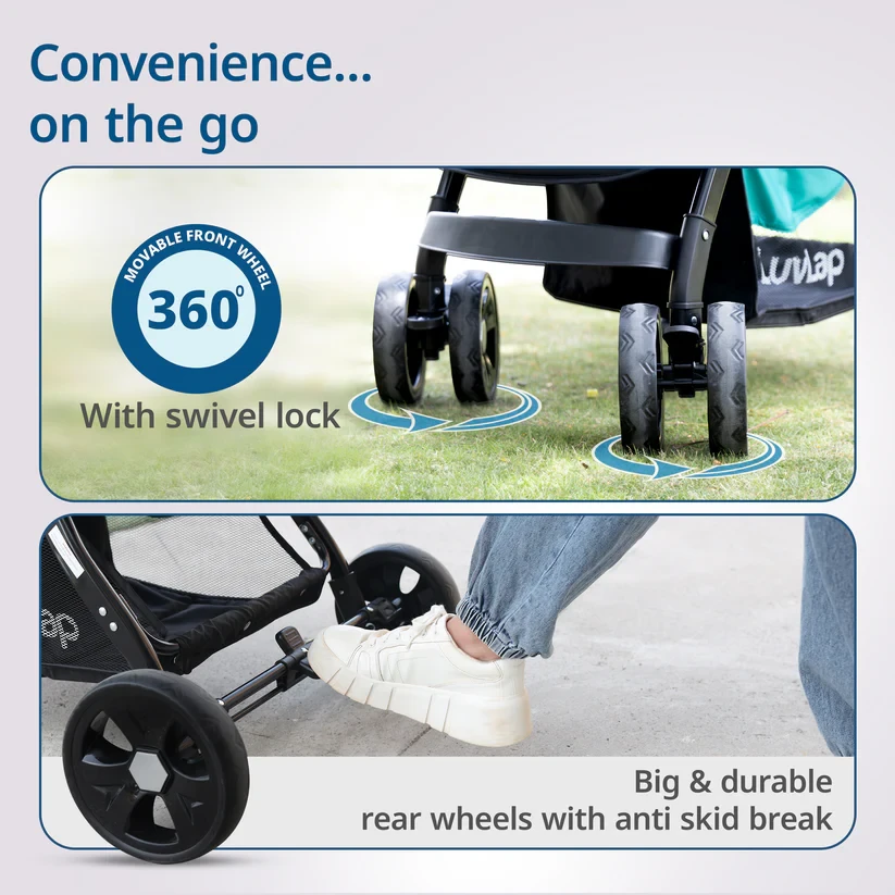 Heavy Duty Wheels: Built to withstand outdoor surfaces, making it a versatile stroller for indoor and outdoor use.