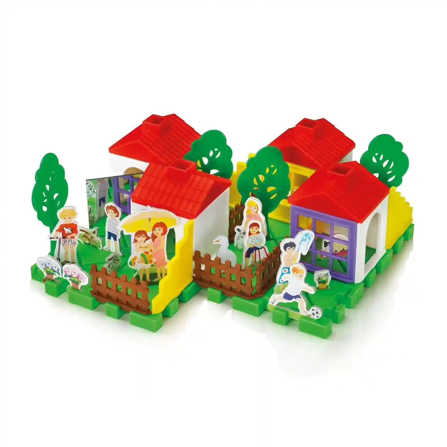 Quercetti Geo Ville 4090 is a multi-piece interlocking construction set, letting children build imaginative villages, scenery, and structures on sturdy base plates.