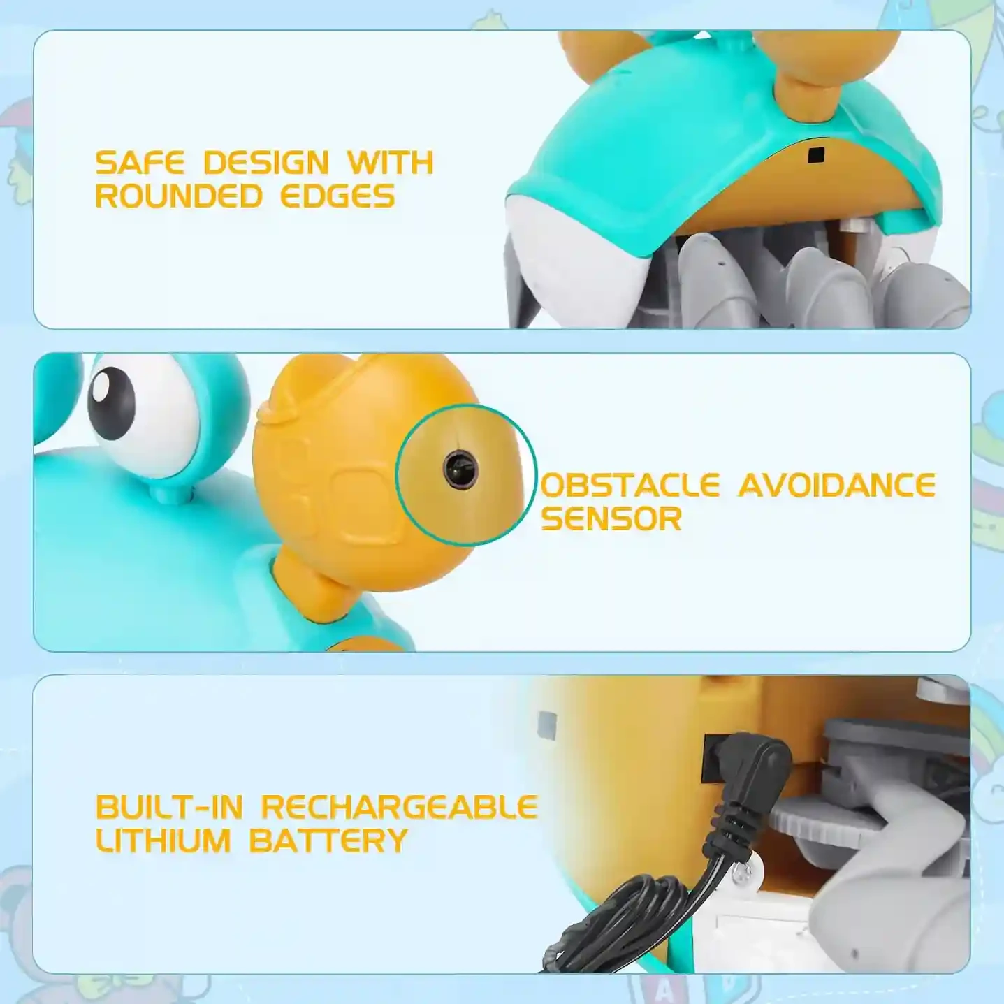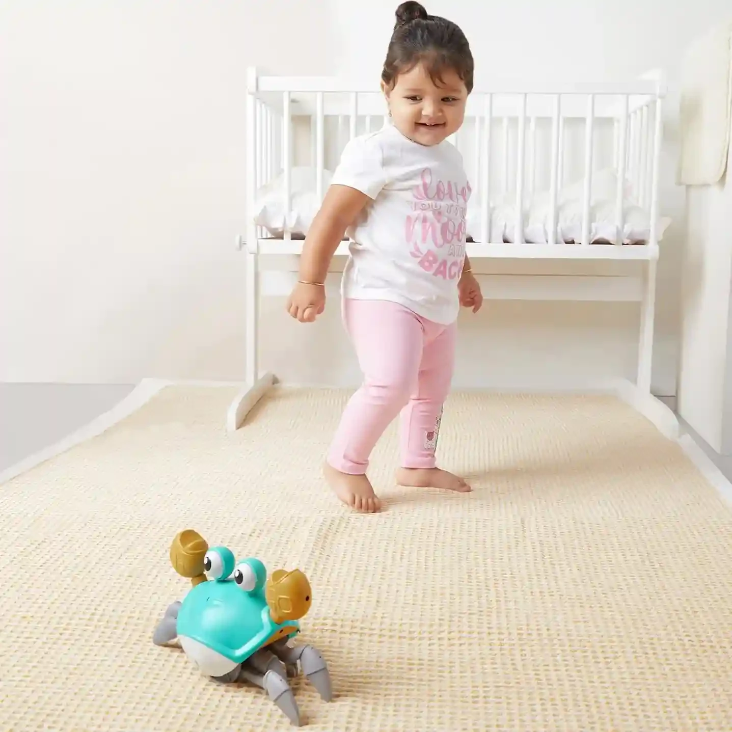 The toy crawls on its own, motivating babies to chase and develop crawling skills.