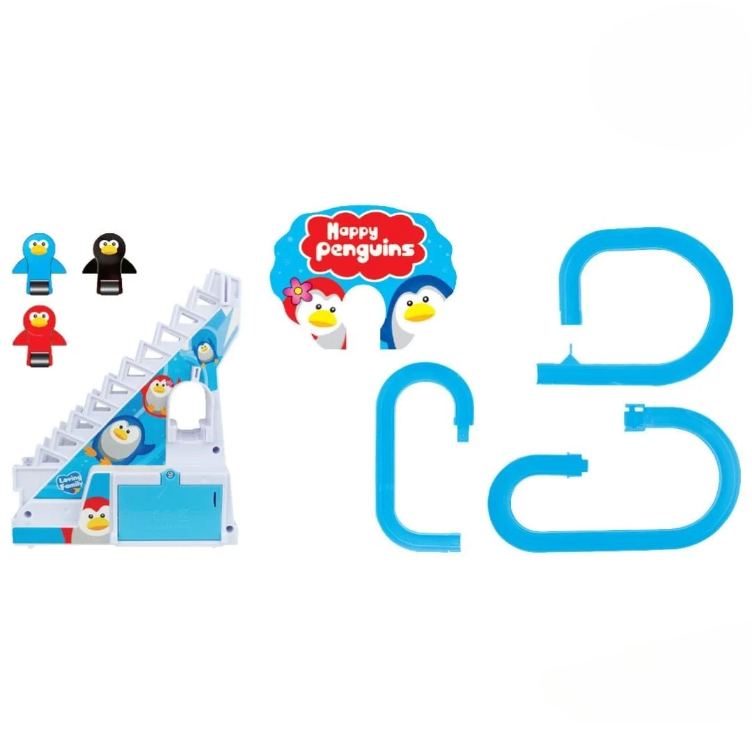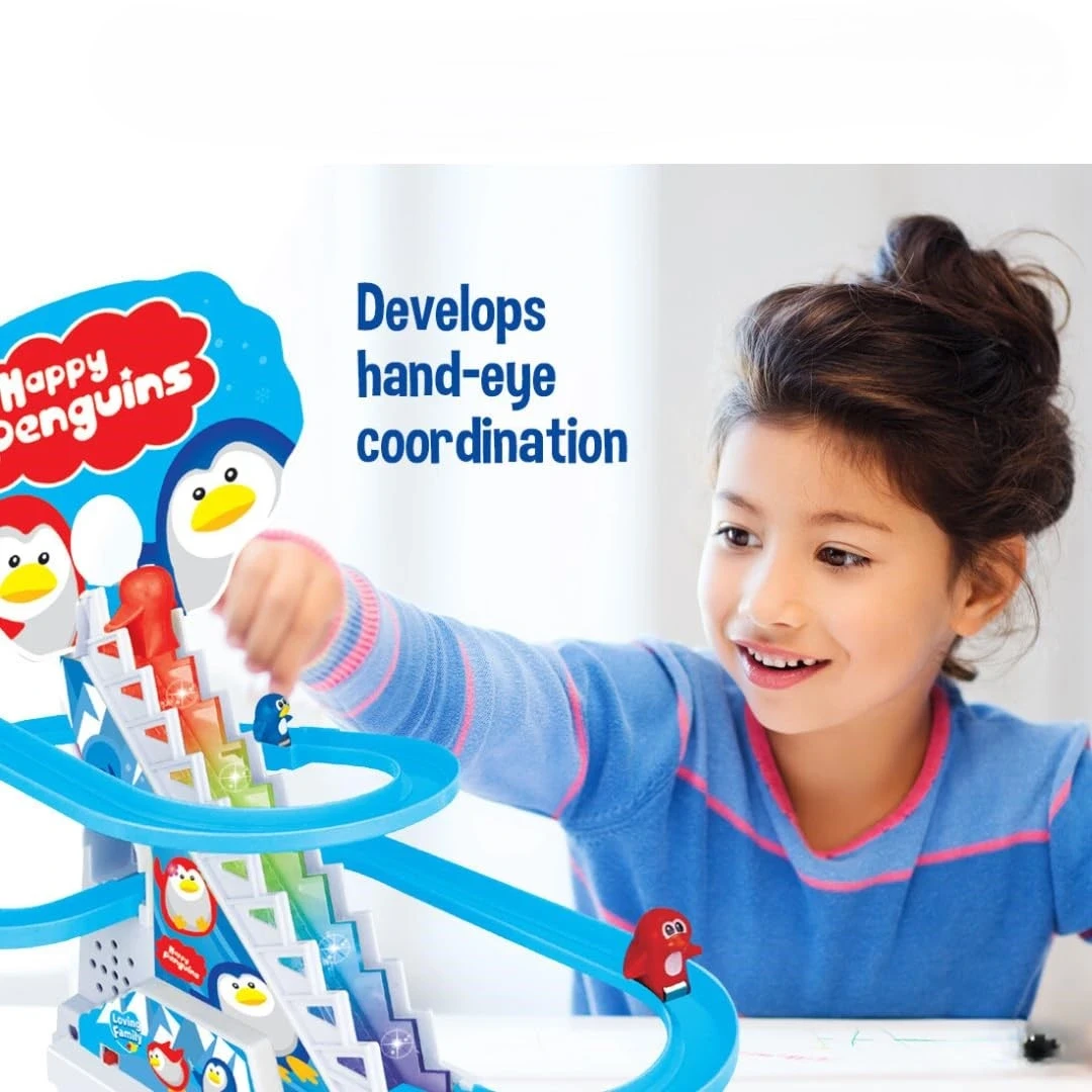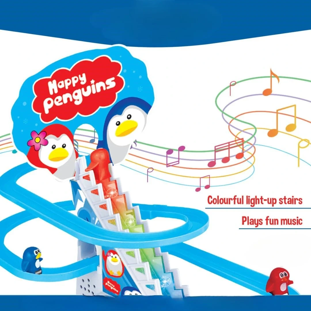 Features 3 adorable penguins that automatically climb stairs and slide down the colorful spiral ramp, accompanied by cheerful music and flashing lights.