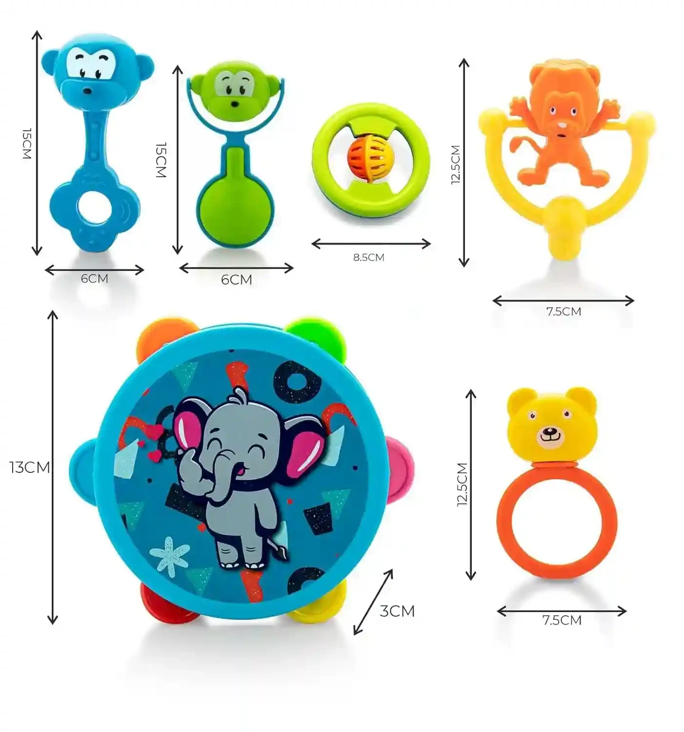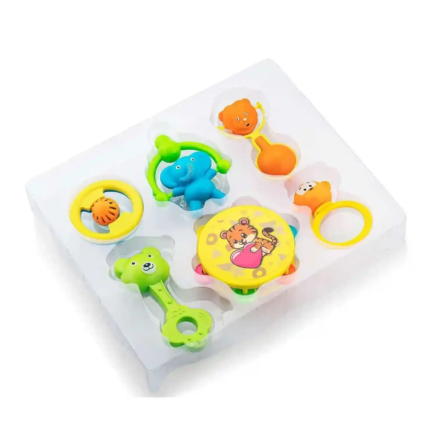 The set includes six uniquely shaped rattles with different textures, providing tactile stimulation and keeping babies entertained.