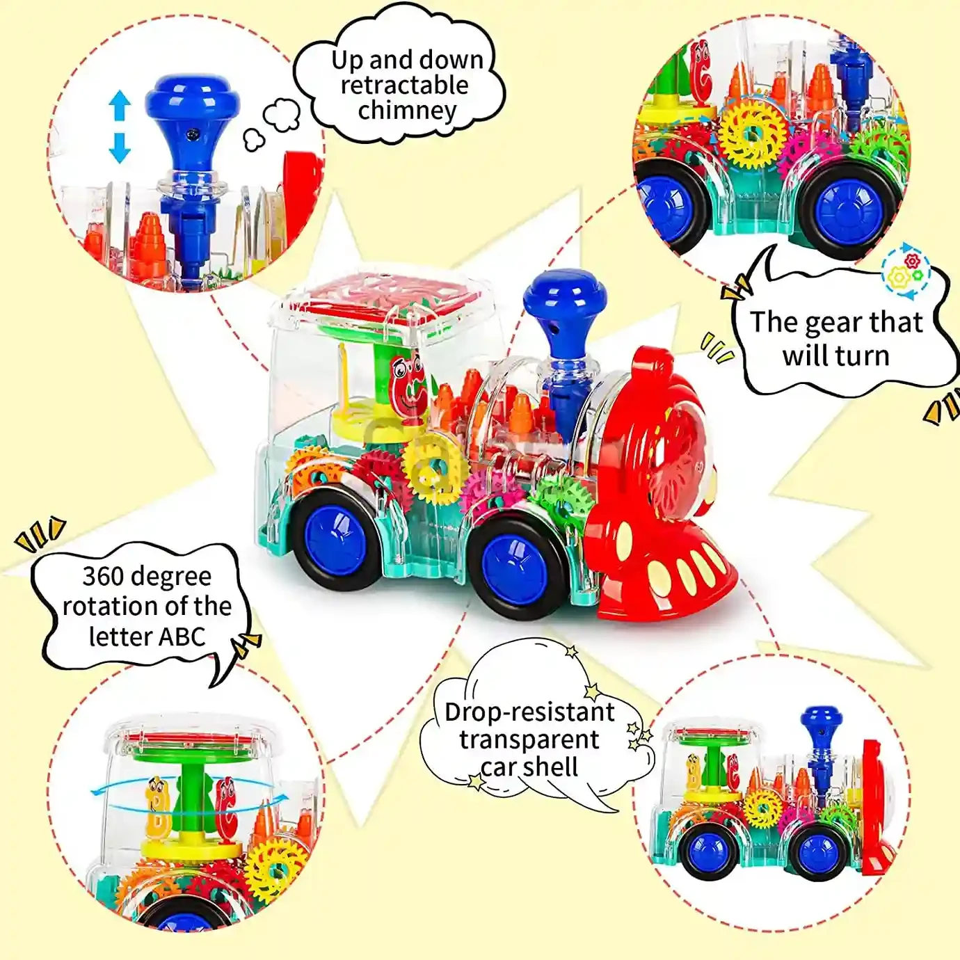The gear-train mechanism continuously rotates in a full circle, showing moving internal gears—very captivating for children’s visual curiosity.