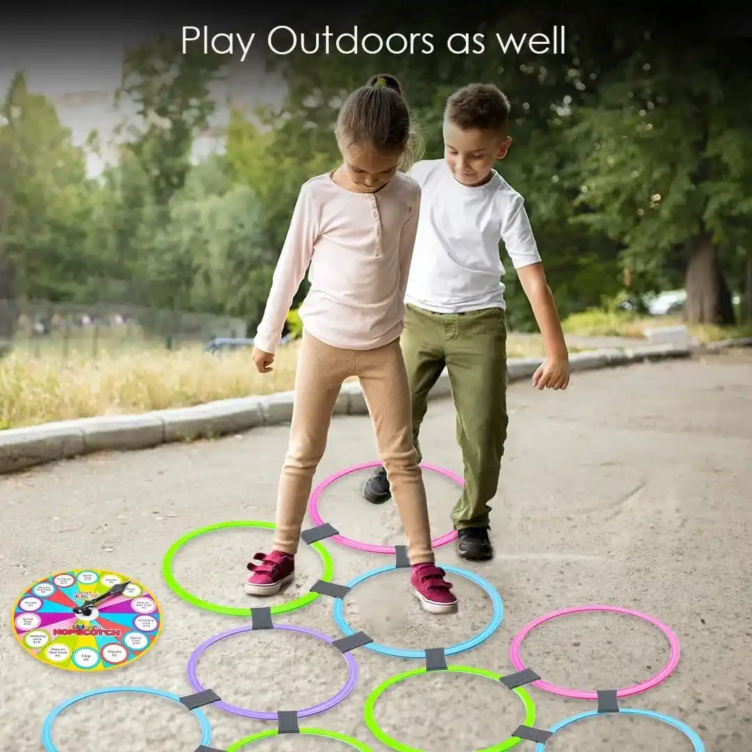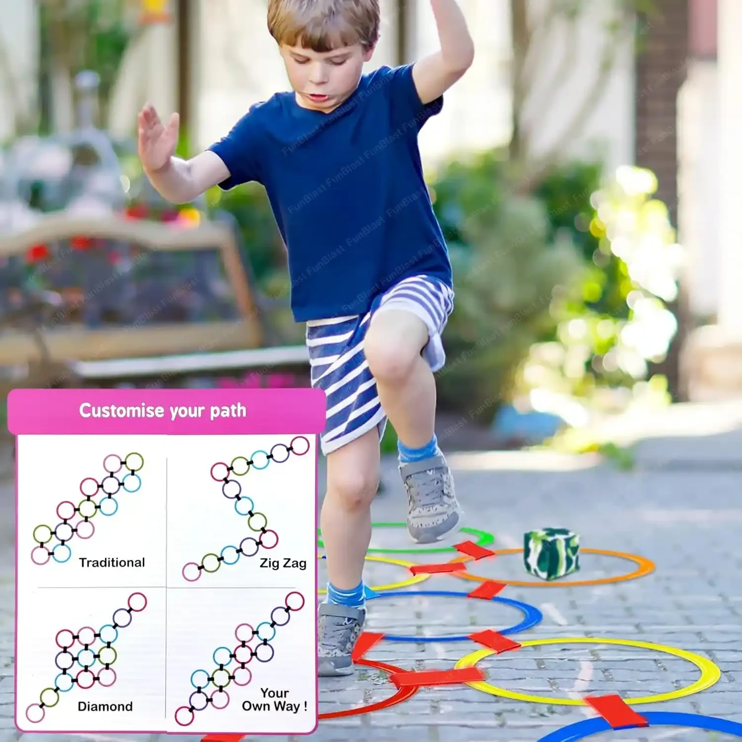 ENGAGING ACTIVE PLAY EXPERIENCE: A dynamic twist on traditional hopscotch, this set of interconnected rings allows kids to jump, hop, and weave through patterns, all year round.