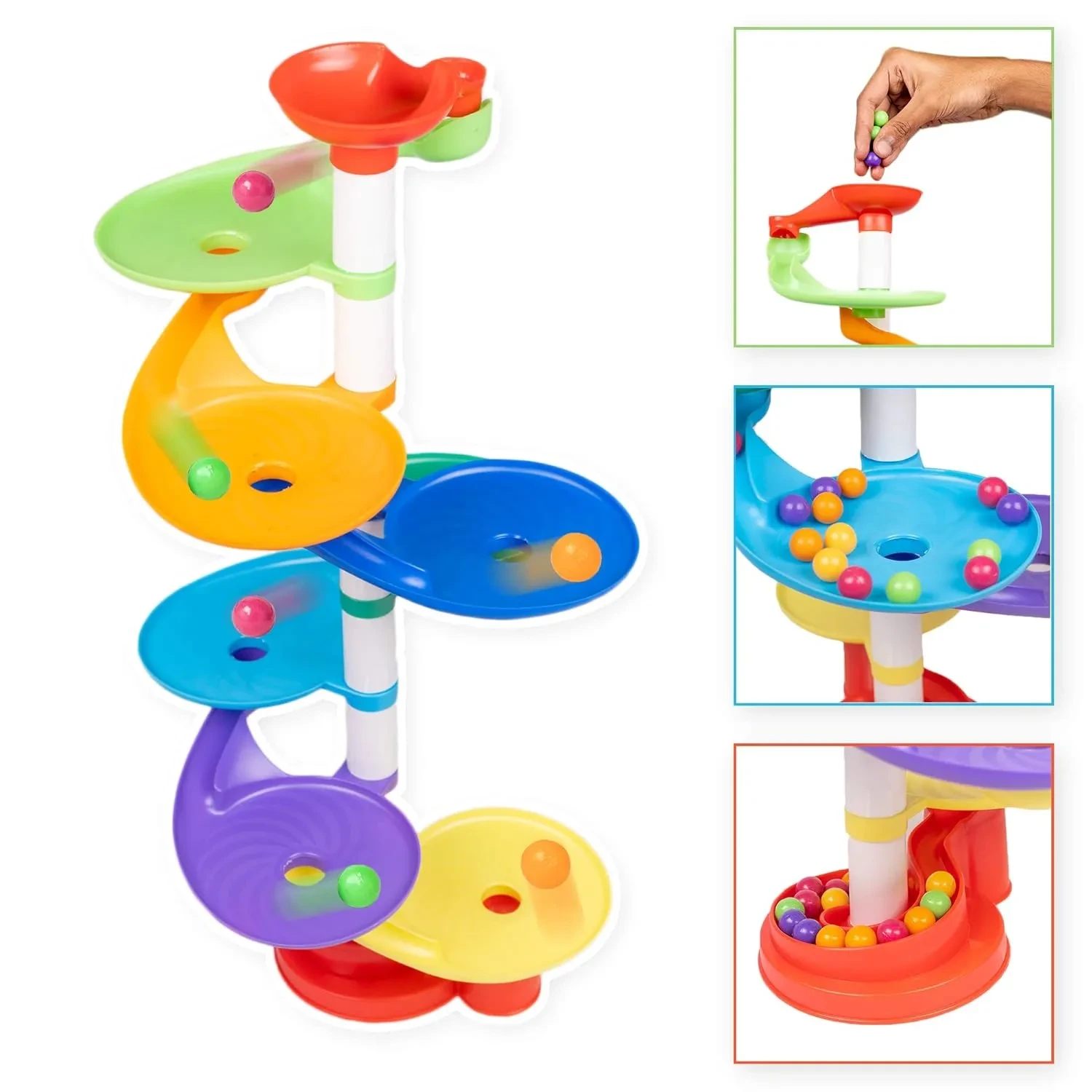Teaches kids about gravity, momentum, and cause-effect as they observe the balls spinning down the spiral ramps. Enhances color recognition and early STEM learning.