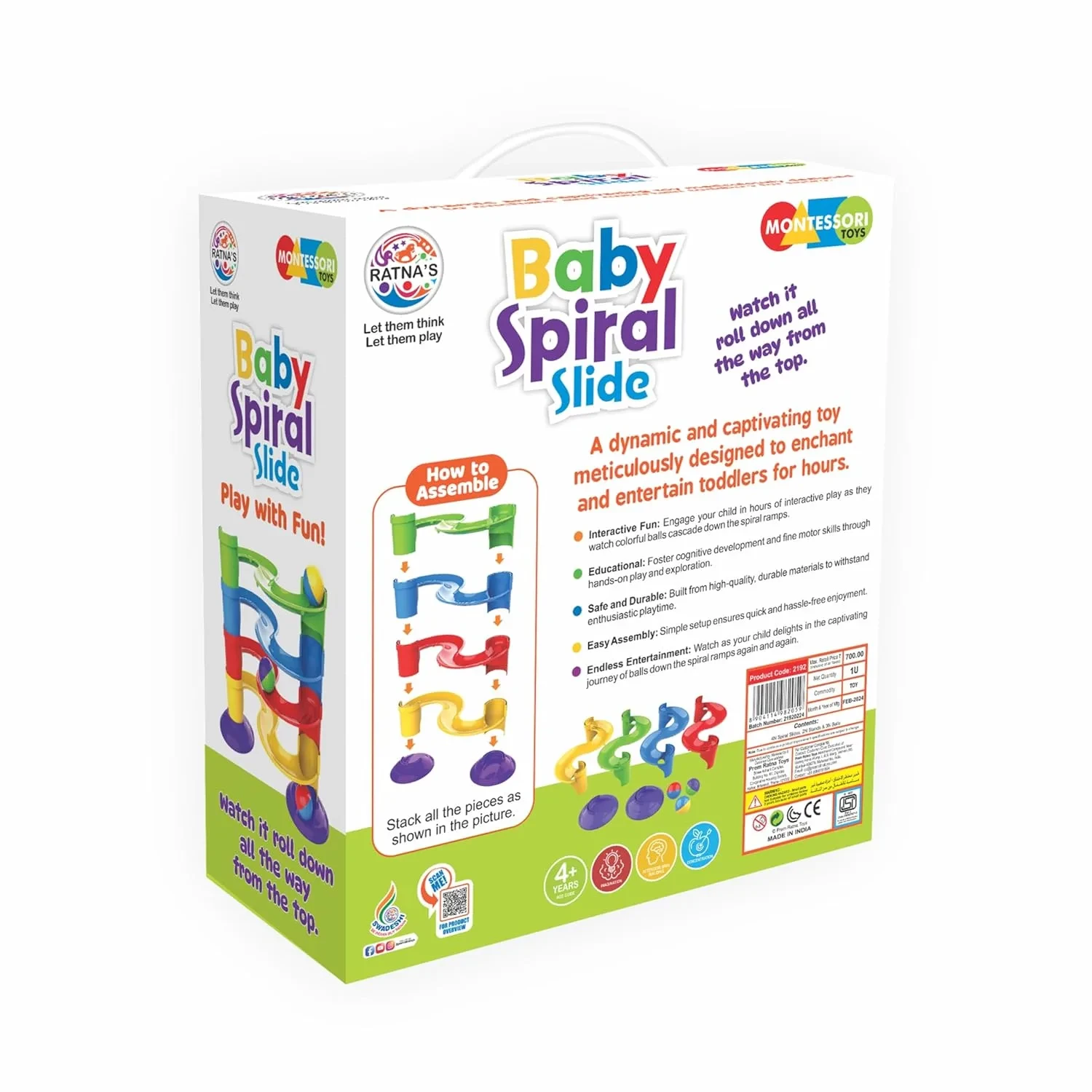 Features four vibrant spiral ramps where soft balls twist and roll down—visually stimulating