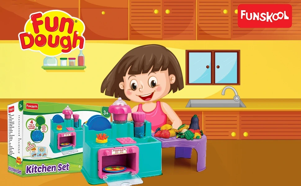 ? All-in-One Kitchen Clay Set: This Funskool Fundough Kitchen Set comes with a pretend stove, utensils, rolling pin, clay tubs, and food-shaped molds – offering a full kitchen pretend-play experience.