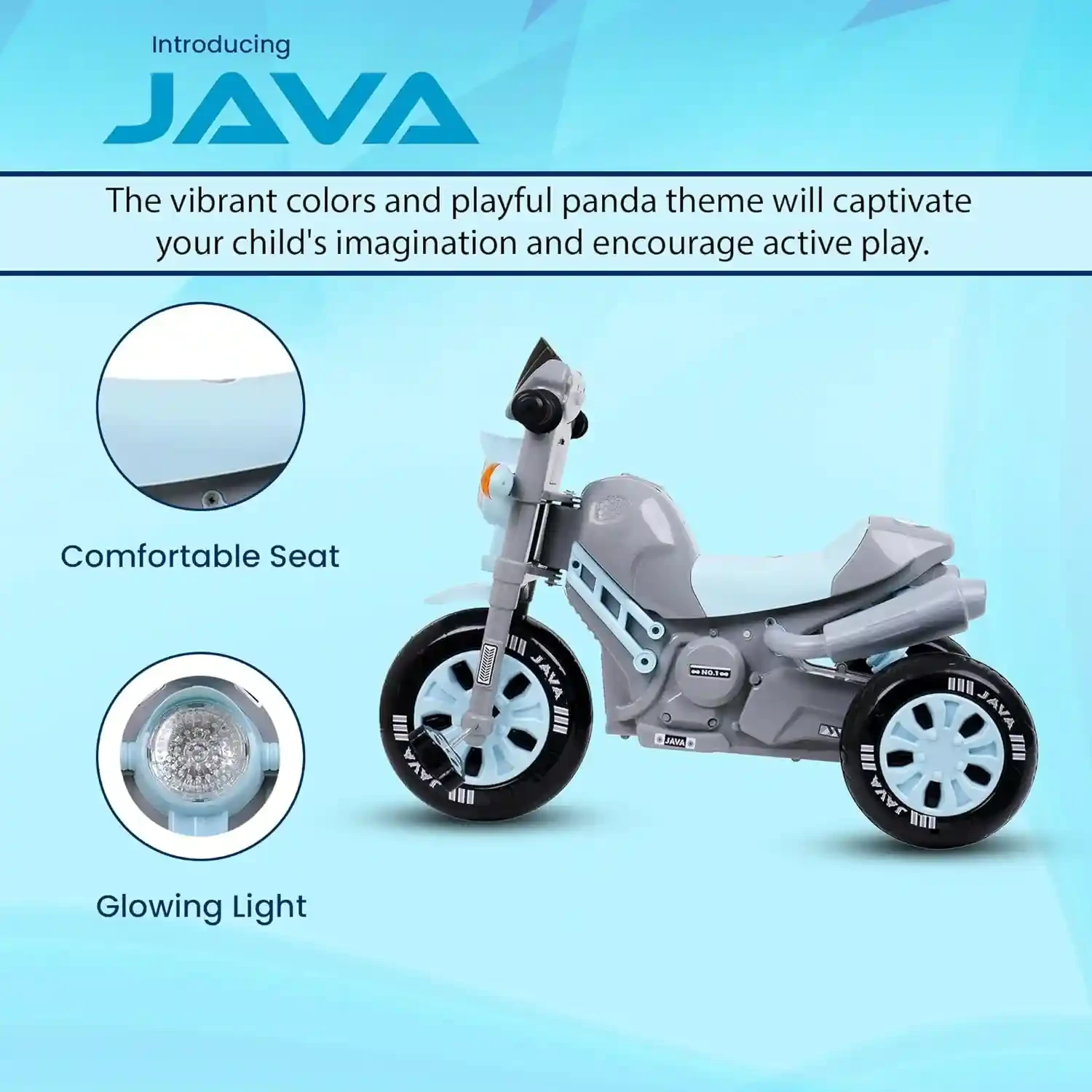 Java Bike Pedal Tricycle for Kids with Musical Horn & Lights – Adjustable Seat, Grey