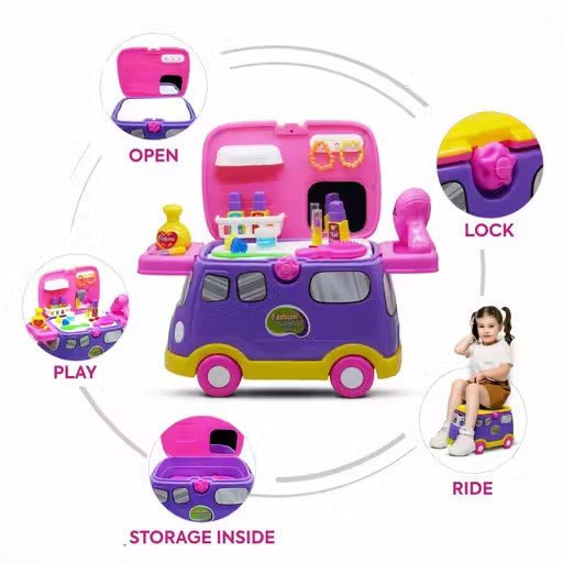 2 IN 1 FASHION VANITY VEHICLE: Combines a stylish rolling vehicle with a functional vanity playset for dual play modes.