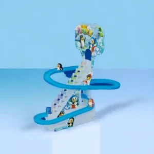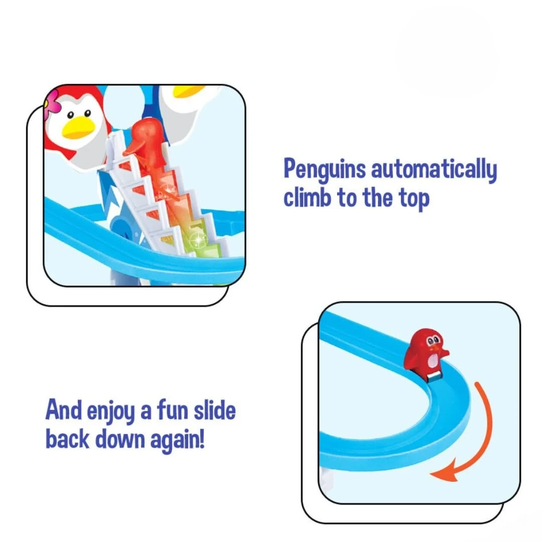 Features 3 adorable penguins that automatically climb stairs and slide down the colorful spiral ramp, accompanied by cheerful music and flashing lights.