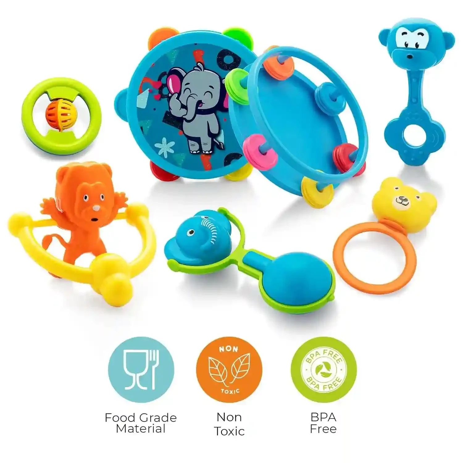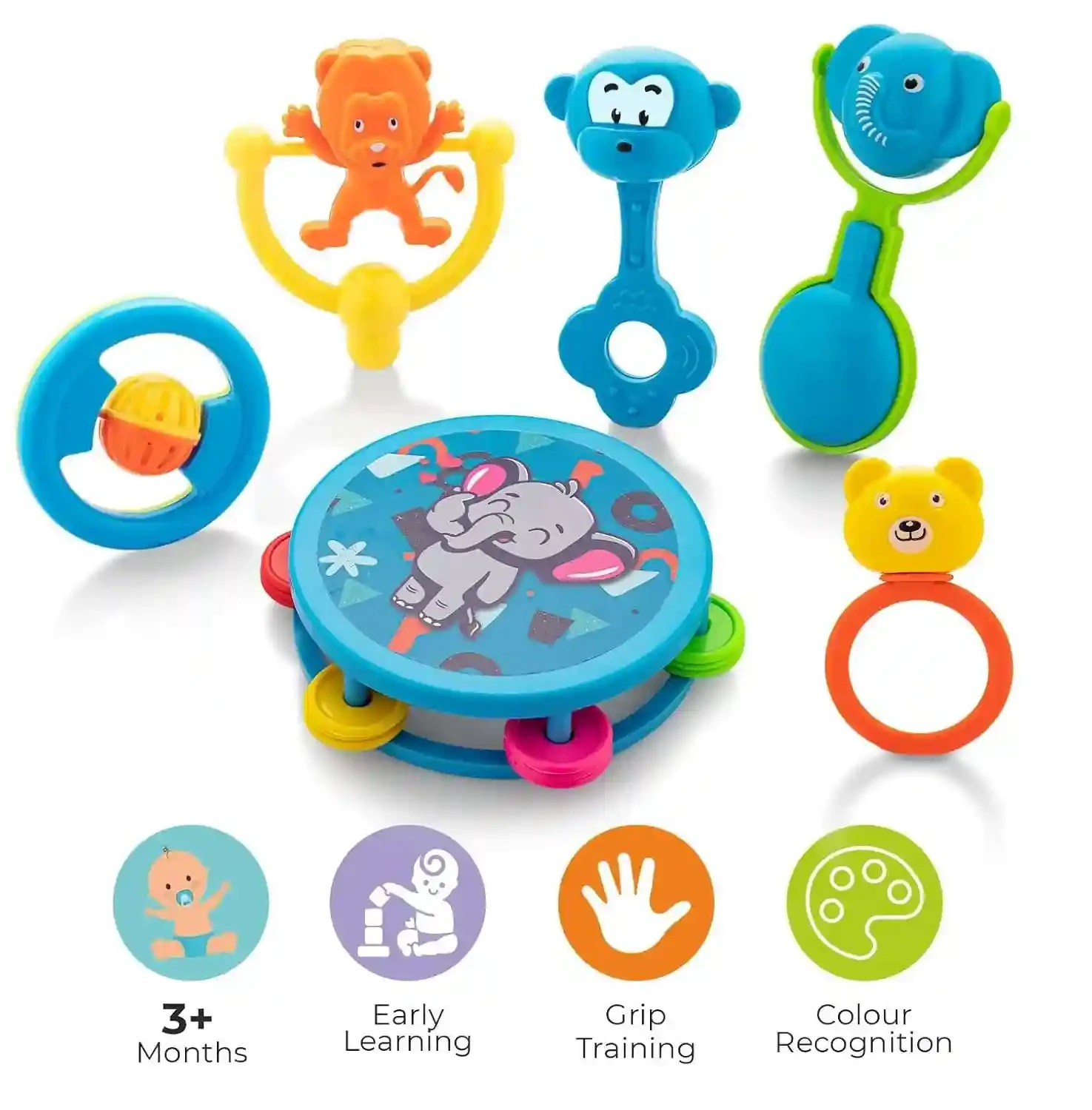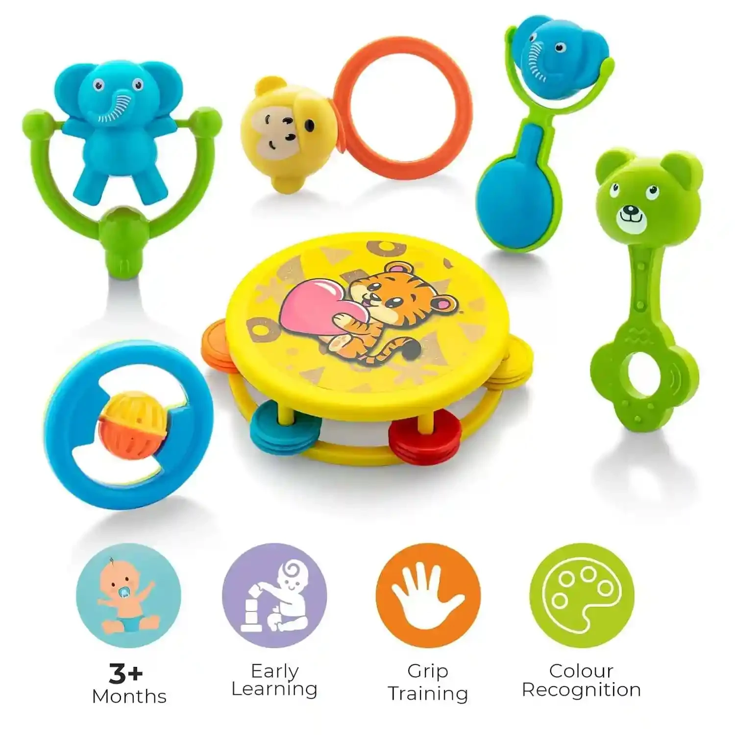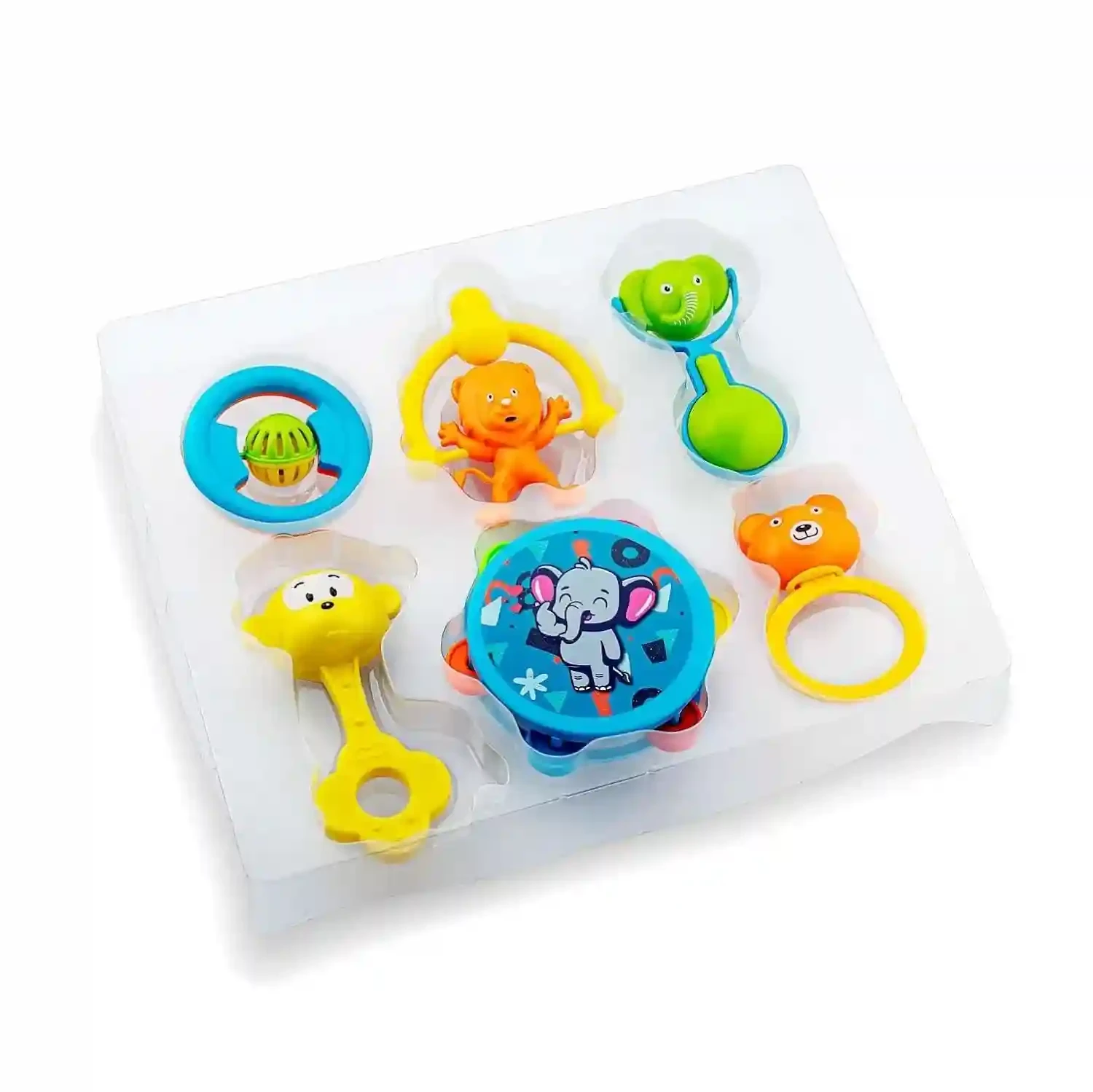 The set includes six uniquely shaped rattles with different textures, providing tactile stimulation and keeping babies entertained.