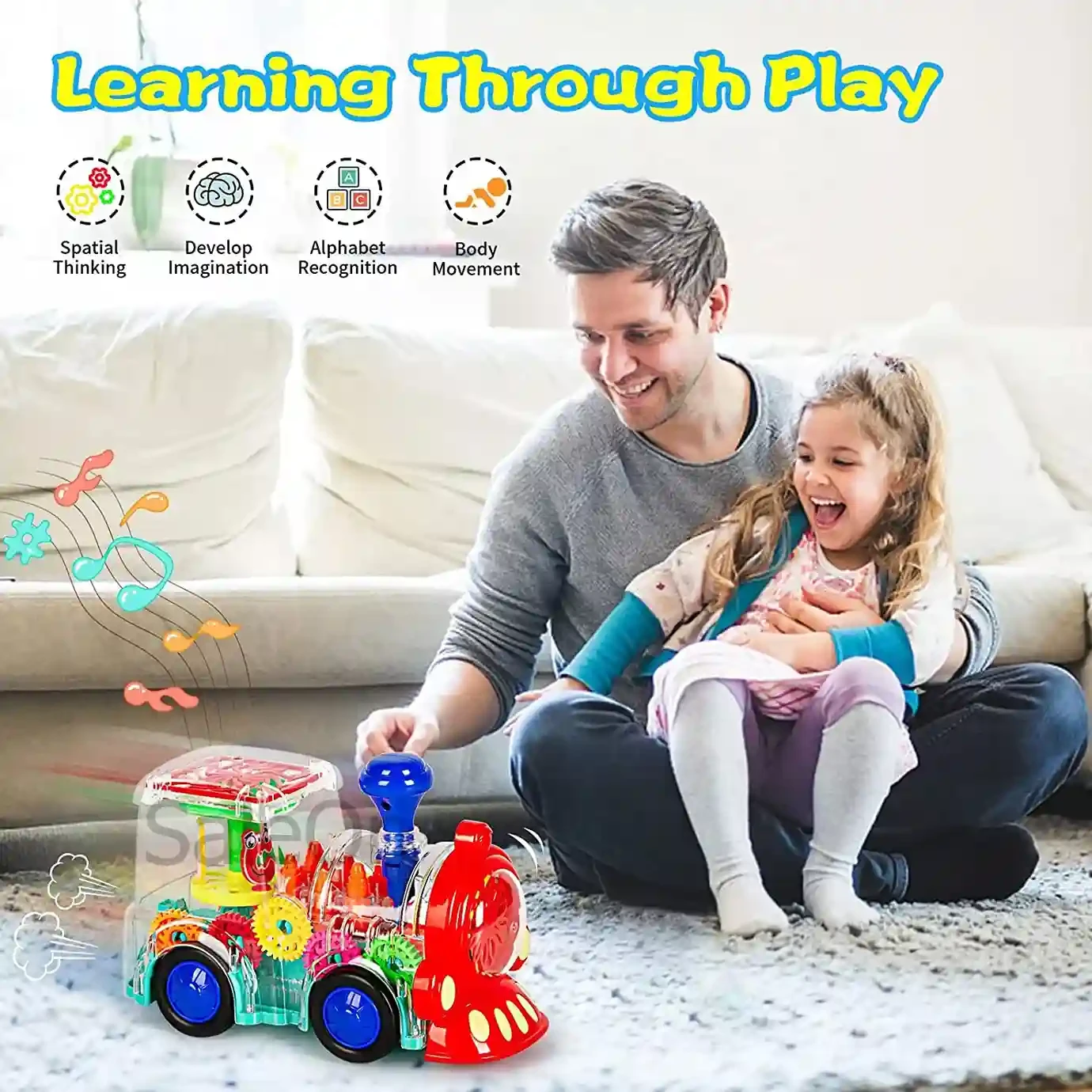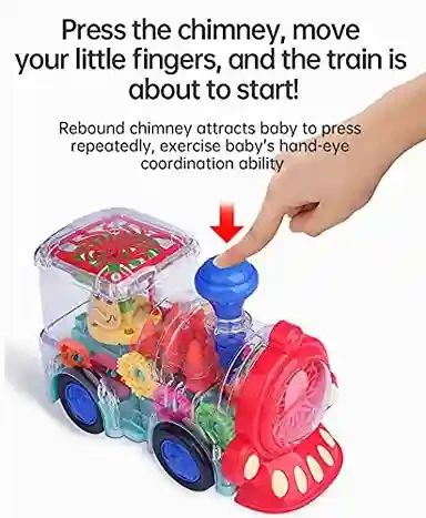 Clear plastic casing lets children see internal gears and workings, teaching basic mechanical concepts like motion, gear interaction, and cause-effect.