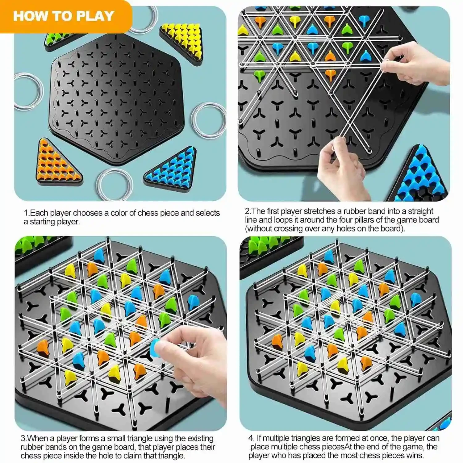INNOVATIVE TRIANGLE DESIGN: This board game uses a hexagonal layout formed by triangle grids—players stretch rubber bands across pegs to capture triangular spaces and outmaneuver opponents.
